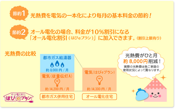 給湯・キッチン・冷暖房等、家中の熱源をすべて電気にすると電気料金メニューの「オール電化割引」がご契約いただけます。![]()