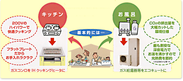 | 工事は標準で1〜2日で完了します。 基本的な工事はガスコンロをIHクッキングヒータに、ガス給湯器等をエコキュートに取り替えます。 ※設置場所・工事内容によっては異なる場合があります。 ![]()